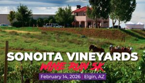 Join us on Saturday, February 14, 2026 at 9:00am for an exciting annual event that features Sonoita Vineyards! The oldest commercial vineyard and winery in Arizona, Sonoita Vineyards was started in 1974, opened in 1983 and now includes over 30 acres of vines. Aided by the unique growing conditions of the Sonoita Appellation (AVA – American Viticultural Area), the winery consistently creates award winning wines, including a Cabernet Sauvignon chosen by national wine critics to serve at a Presidential Inauguration Gala. Perched at an elevation of 5,000 feet among rolling grasslands, the vineyard is surrounded on three sides by soaring mountain ranges. With extra swag options for all wine lovers, walkers and runners, this race is a sure thing for a great time! This race is timed and scored by J3 Timing. Results will be posted at www.J3Timing.com.
